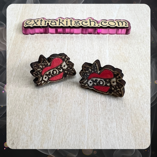 Old School Mom Tattoo Earrings – Hand-Painted Wooden Studs