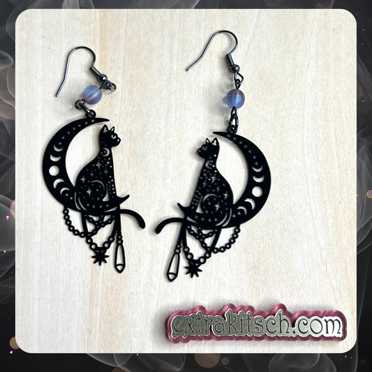 Boho Cat & Crescent Moon Earrings – Gold or Black