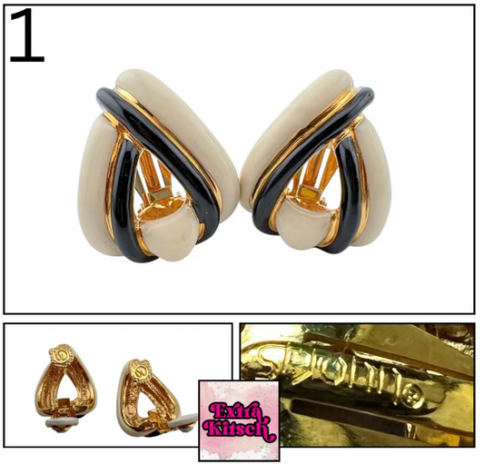St. John Black & Cream Vintage Enamel Clip-On Earrings