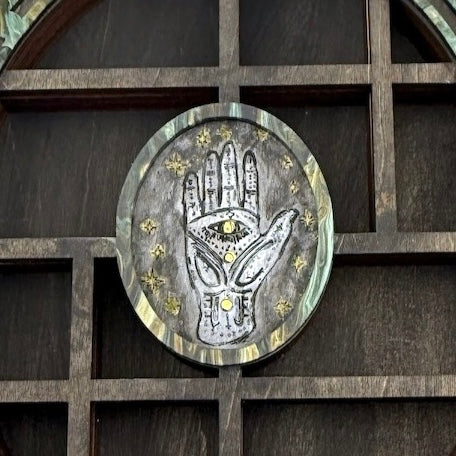 Palmistry Crystal Curio Shelf – Round Gothic Wall Shelf with Acrylic Overlay