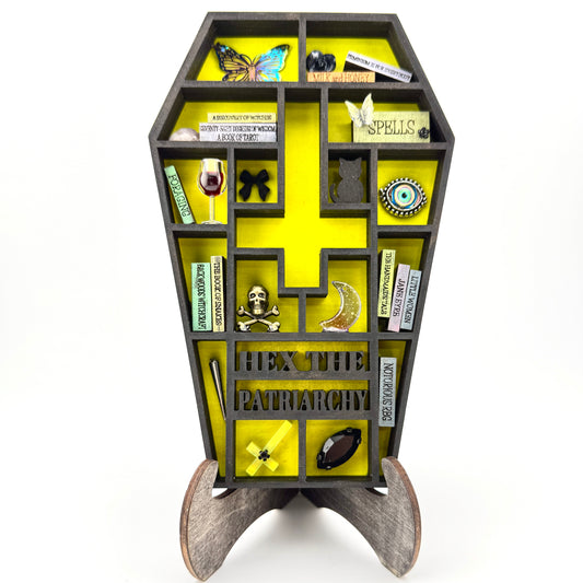 Hex the Patriarchy Mini Coffin Bookshelf – Handmade Feminist Curio Shelf with Miniatures