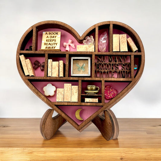 Mini Heart Bookshelf – Tiny Curio Shelf with Books & Trinkets