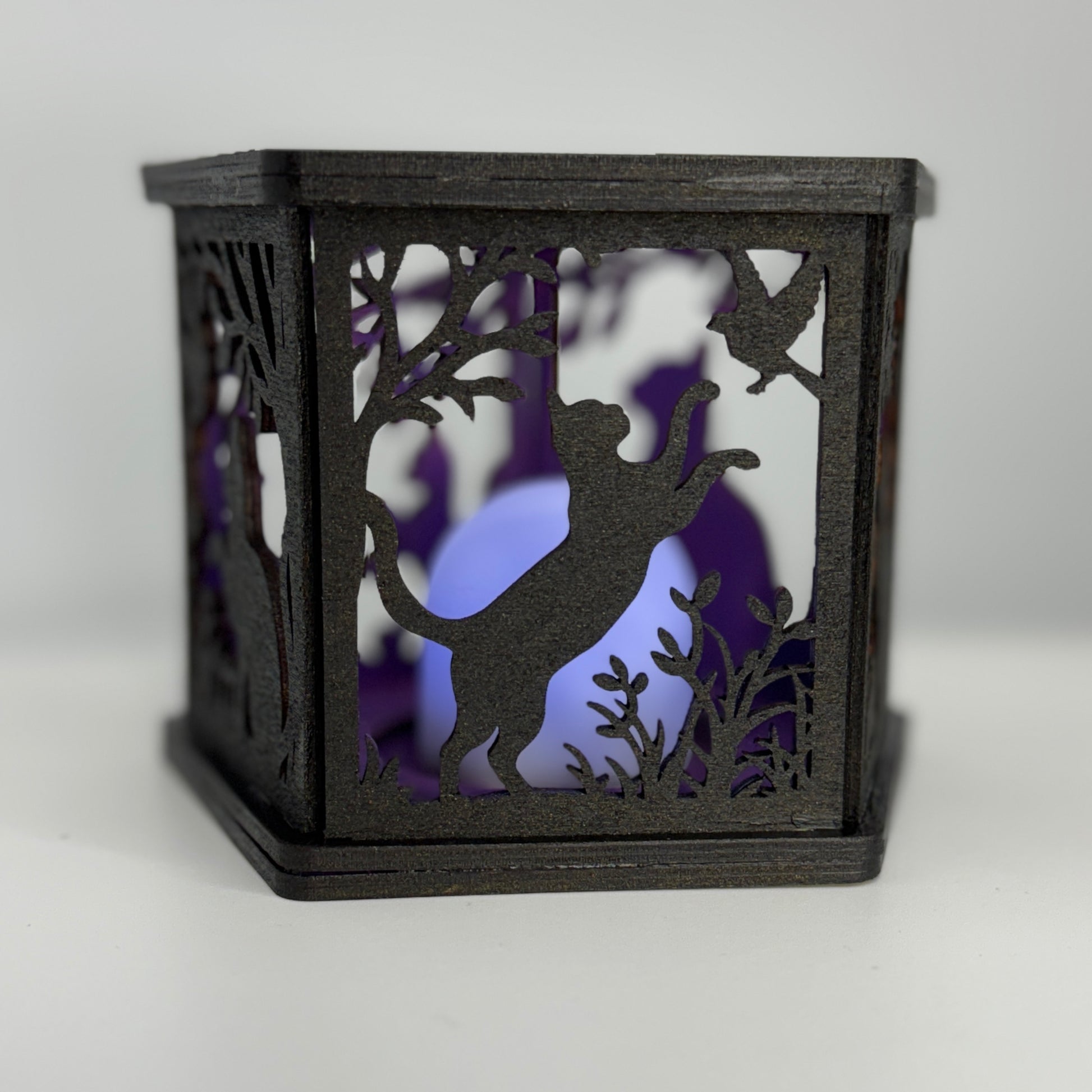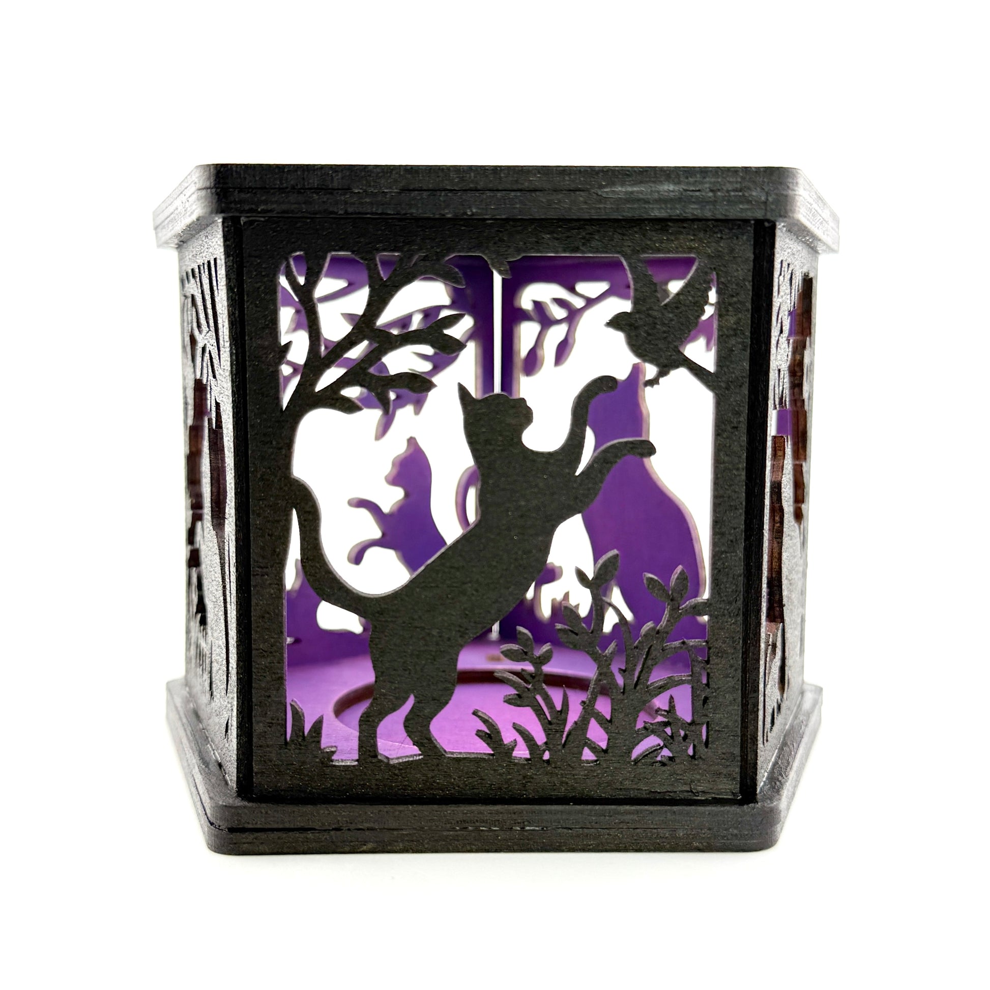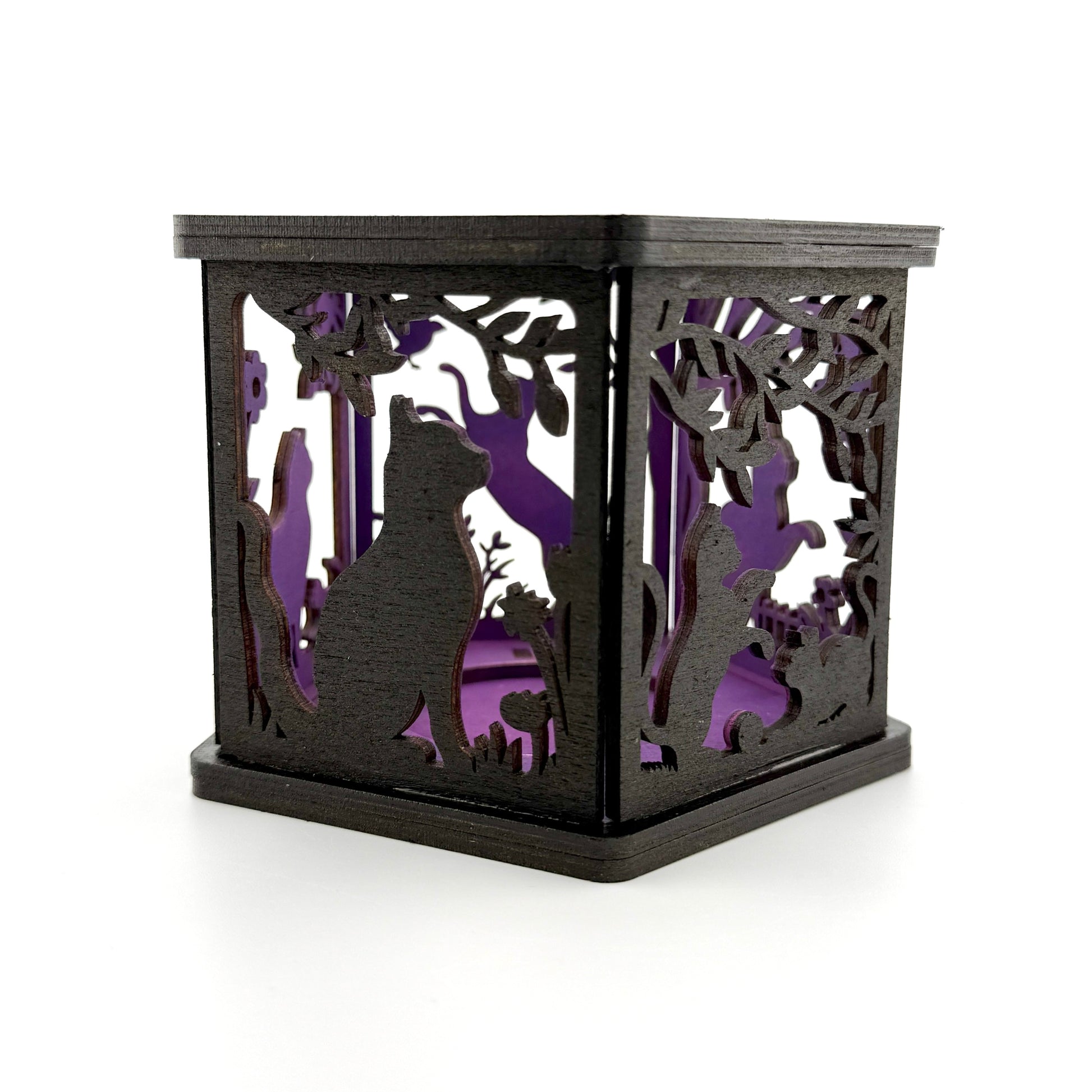 Handmade laser-cut cat lantern with a color-changing LED tealight included. The lantern is painted black on the outside and finished with a bright interior in blue, purple, or hot pink that glows when the light is on. The panels feature cats and leafy vines that create a soft, patterned glow in a dark room.
