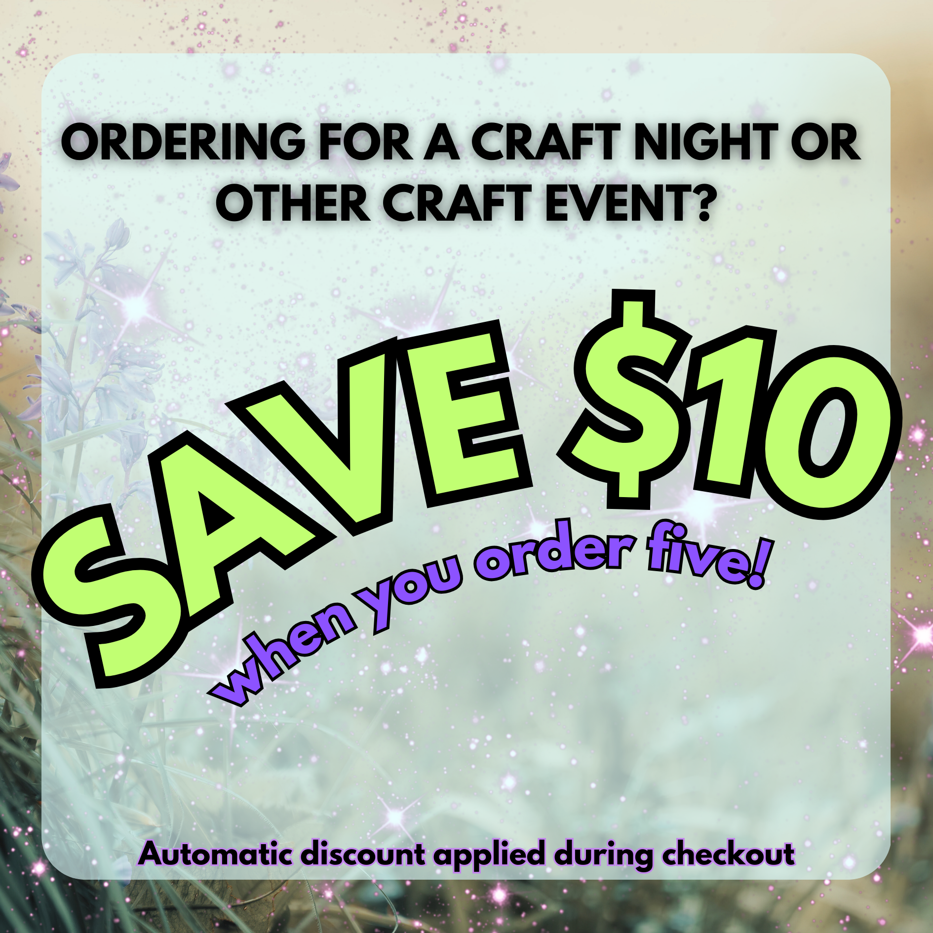 Ordering for a craft night? Get $10 off of 5 mini shelf kits! Automatic discount in cart. No code needed.