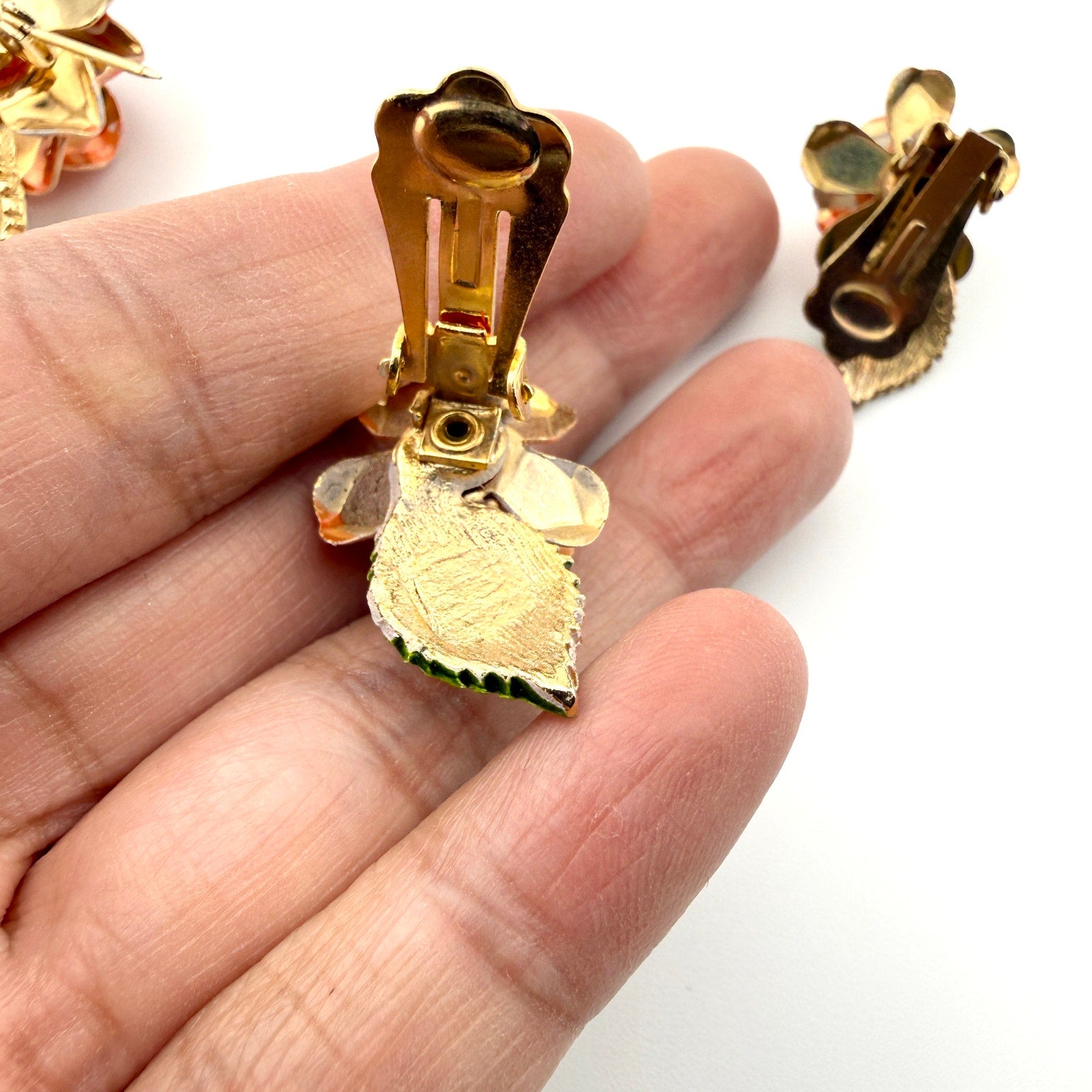 Bright and cheerful vintage floral jewelry set featuring a matching brooch and clip-on earrings with vibrant orange rhinestone centers.