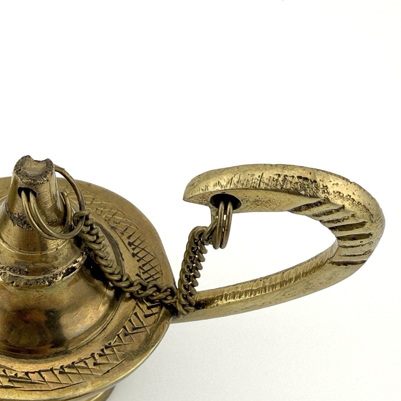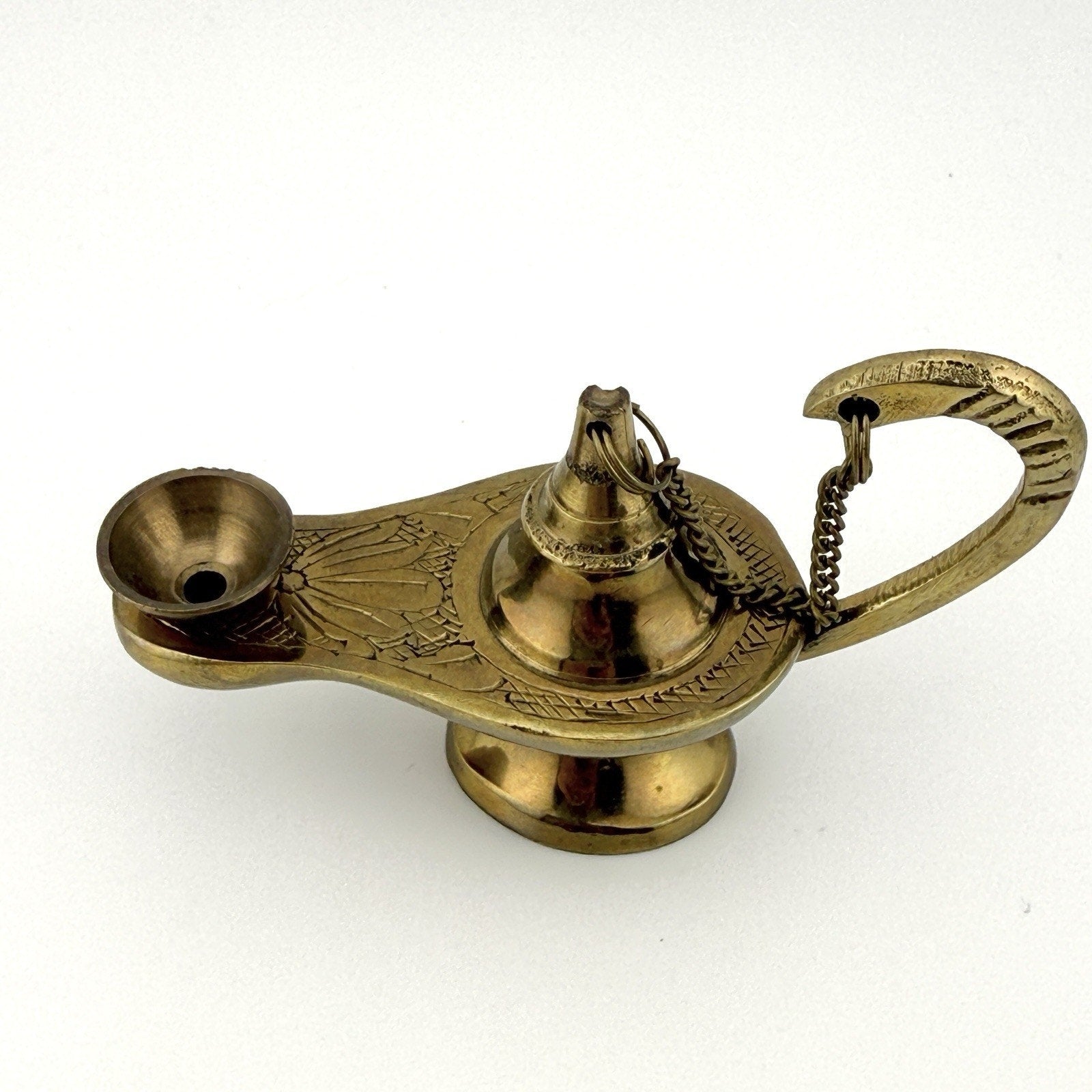 Bring something magical into your space with this vintage brass genie lamp featuring beautiful floral engraving. This miniature decorative lamp has a classic Aladdin look to it and the brass has warm aged patina that give off total vintage vibes (this is a TRUE vintage item).