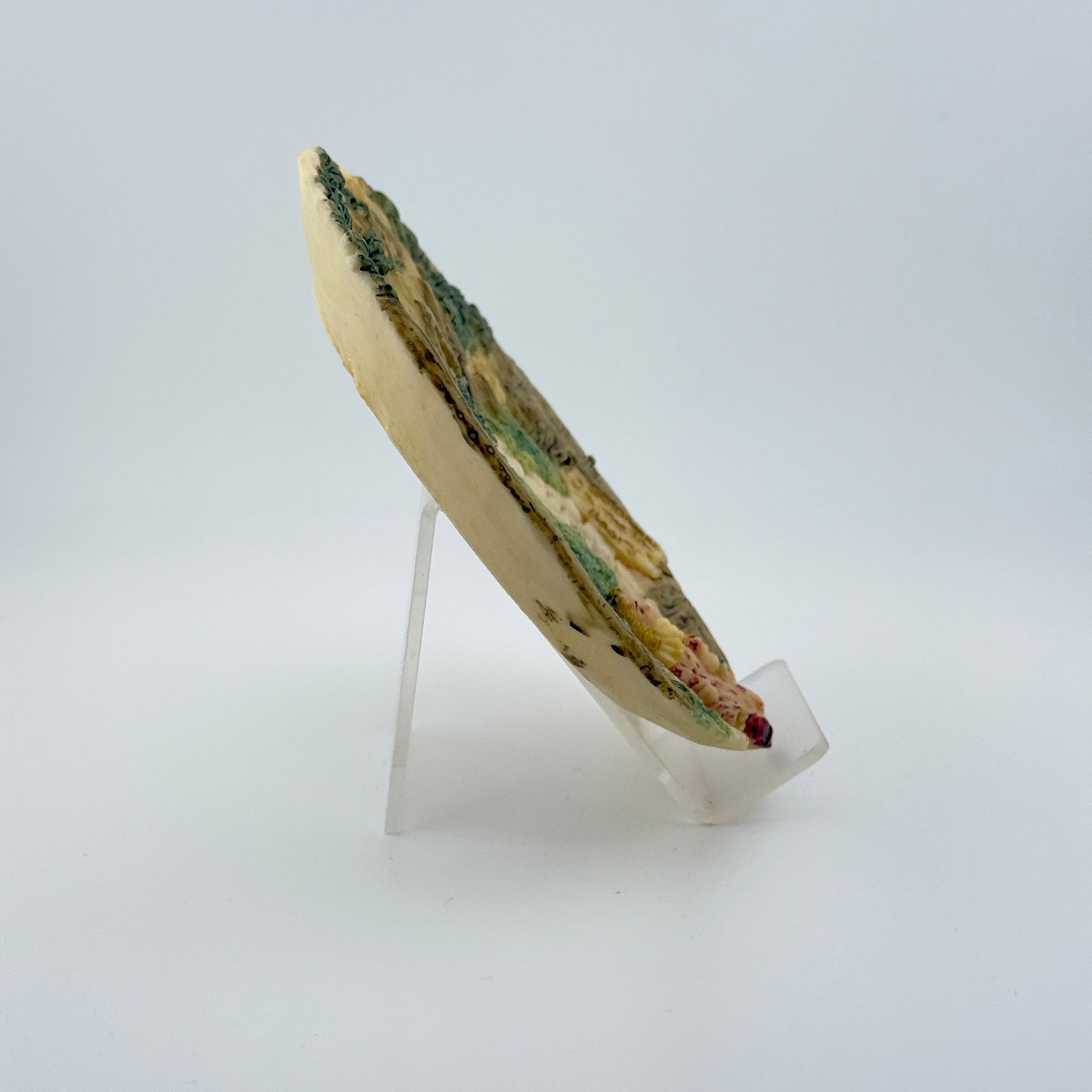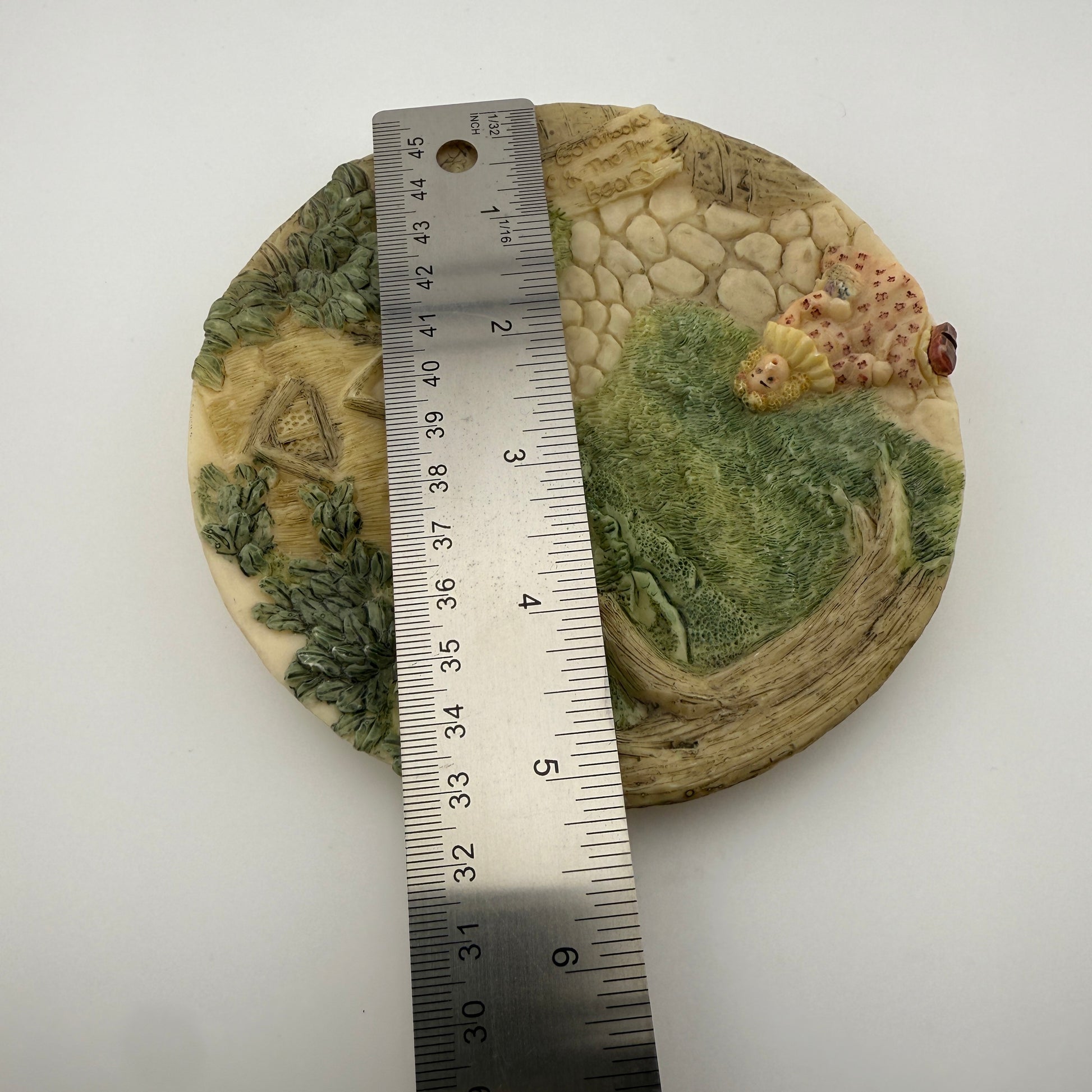 Vintage Goldilocks and the Three Bears collector plate featuring a detailed 3D sculpted fairytale scene. The round plate design shows Goldilocks seated along a winding path leading to a storybook cottage, surrounded by textured trees and landscape details. This is a decorative collector plate, not a flat printed plate. The raised relief and sculptural depth give it a charming storybook quality that fits beautifully with cottagecore, nursery, or fairytale-themed collections. • Vintage Goldilocks & the Three Bears collector plate • Three-dimensional sculpted relief scene • Fairytale / storybook cottage design • Decorative display plate (not for food use) • Material appears to be resin • Pre-owned vintage condition with light age wear • See photos for measurements and surface details |
