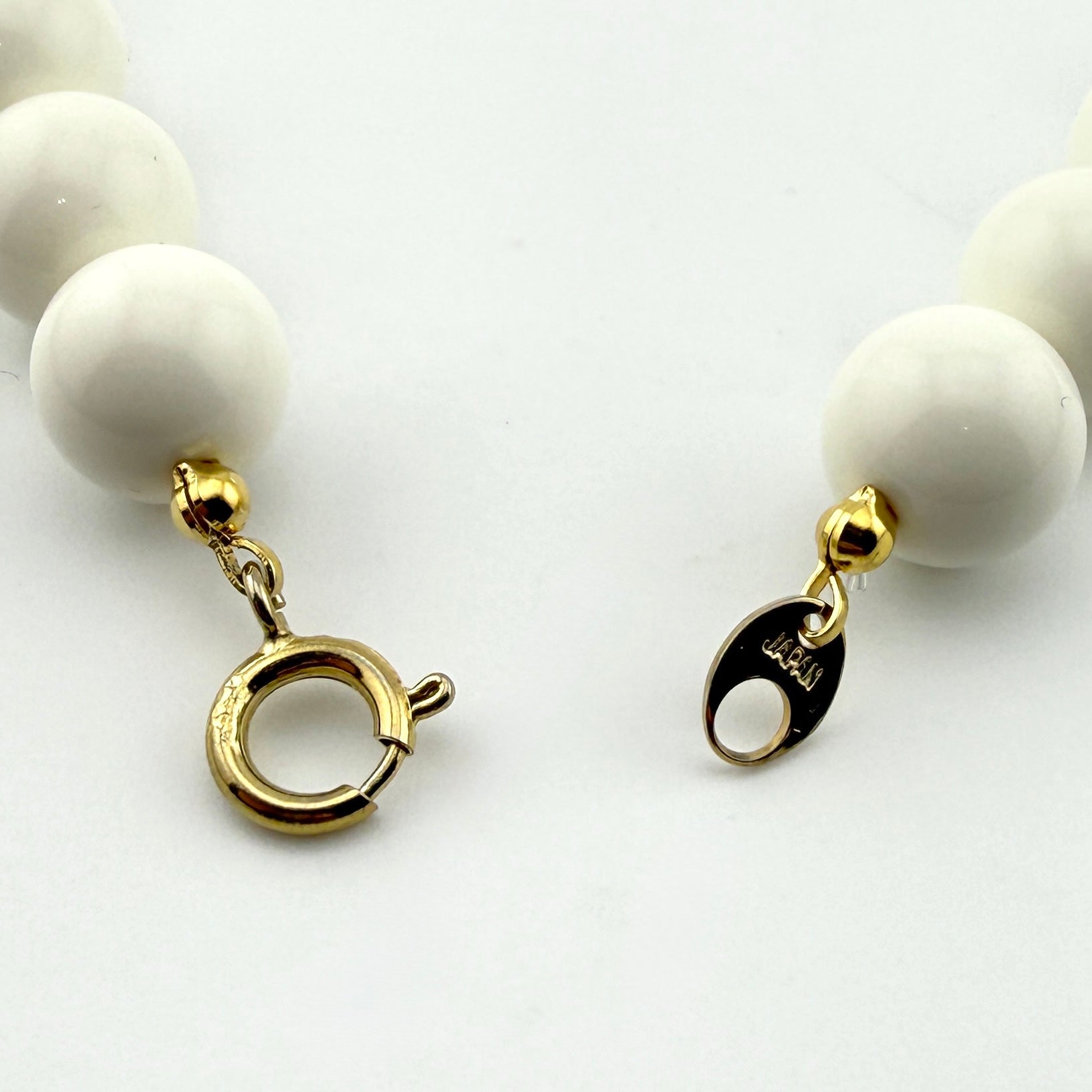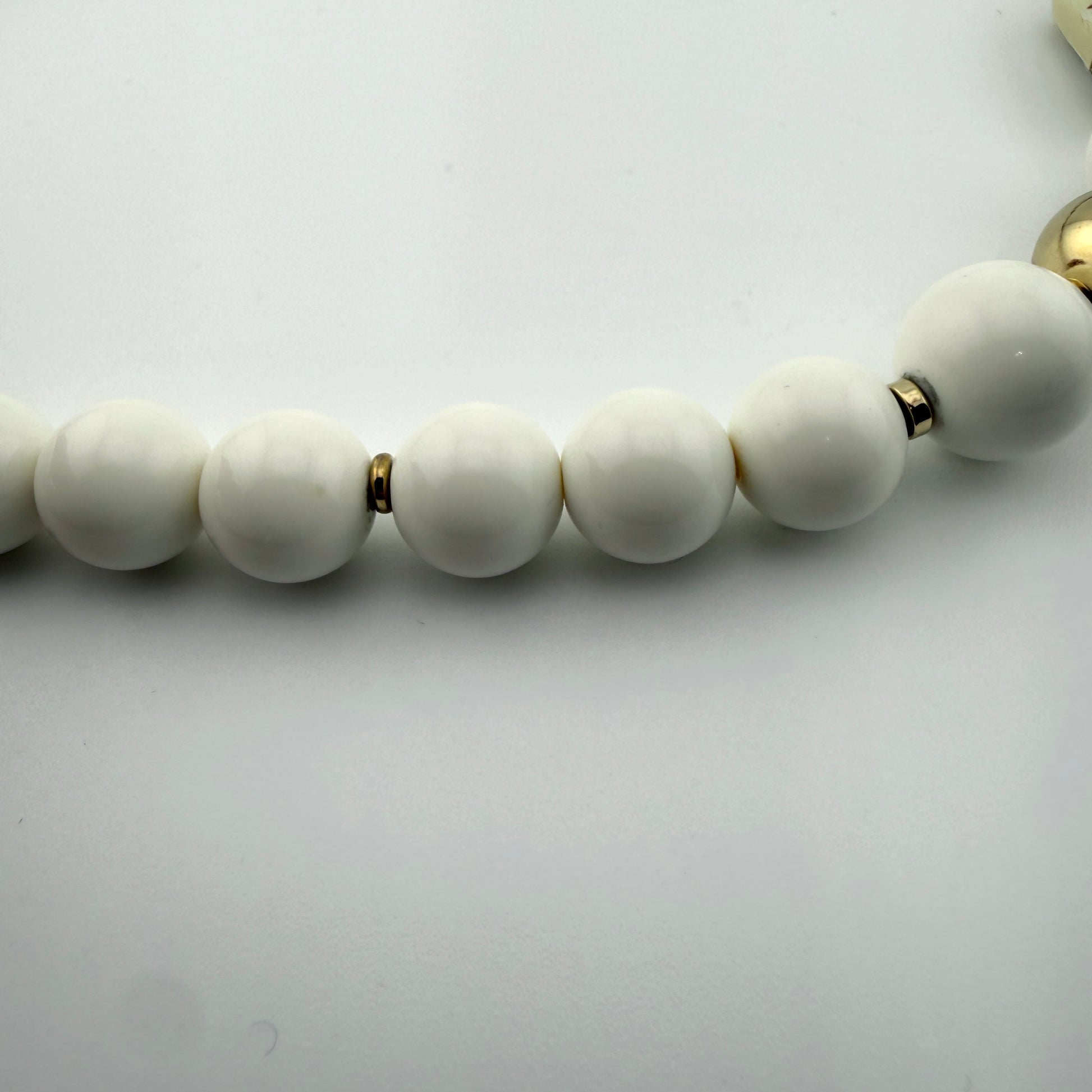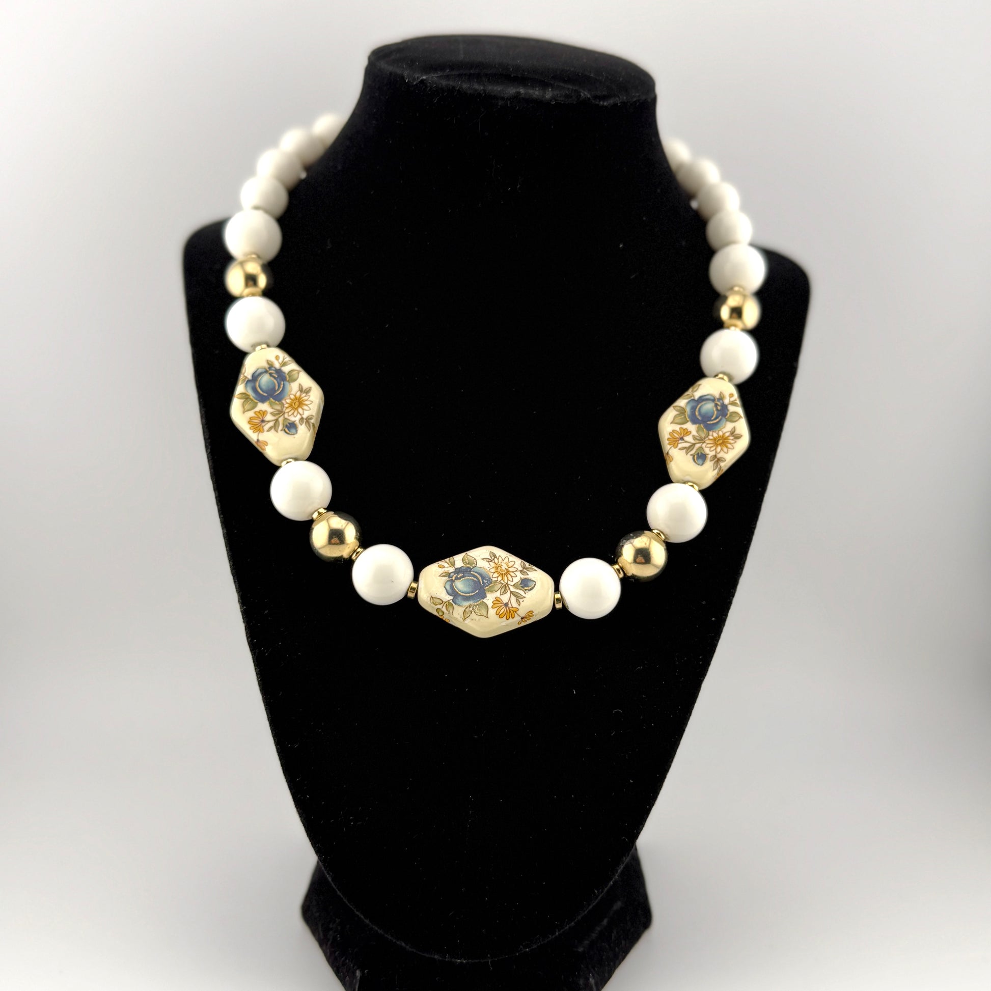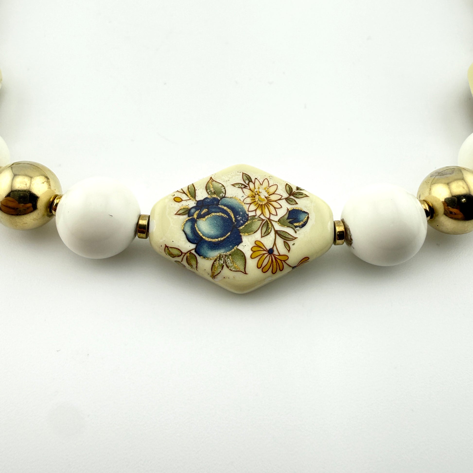 Beautiful cottage style white beaded necklace with geometric accent beads showing a blue floral design.