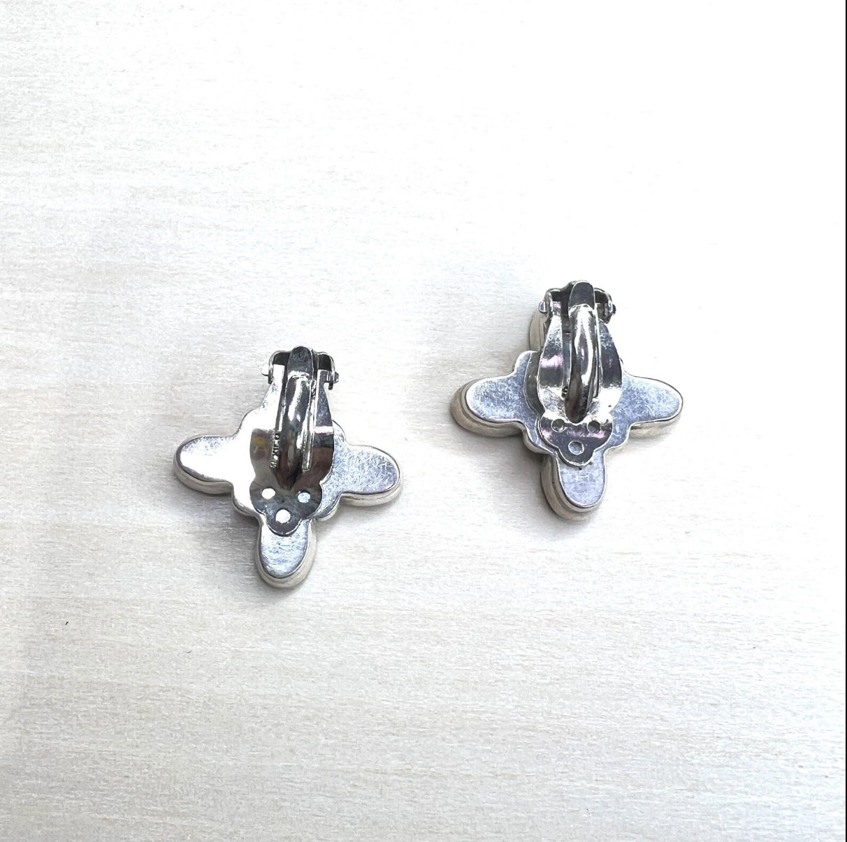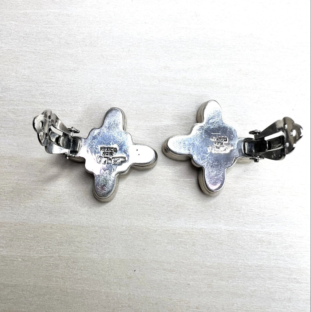 These handcrafted Mexican sterling silver clip-on earrings feature a floral-style design with oval green cabochons resembling malachite, set in 925 silver. A gorgeous statement piece for anyone who loves unique vintage jewelry, no pierced ears required.