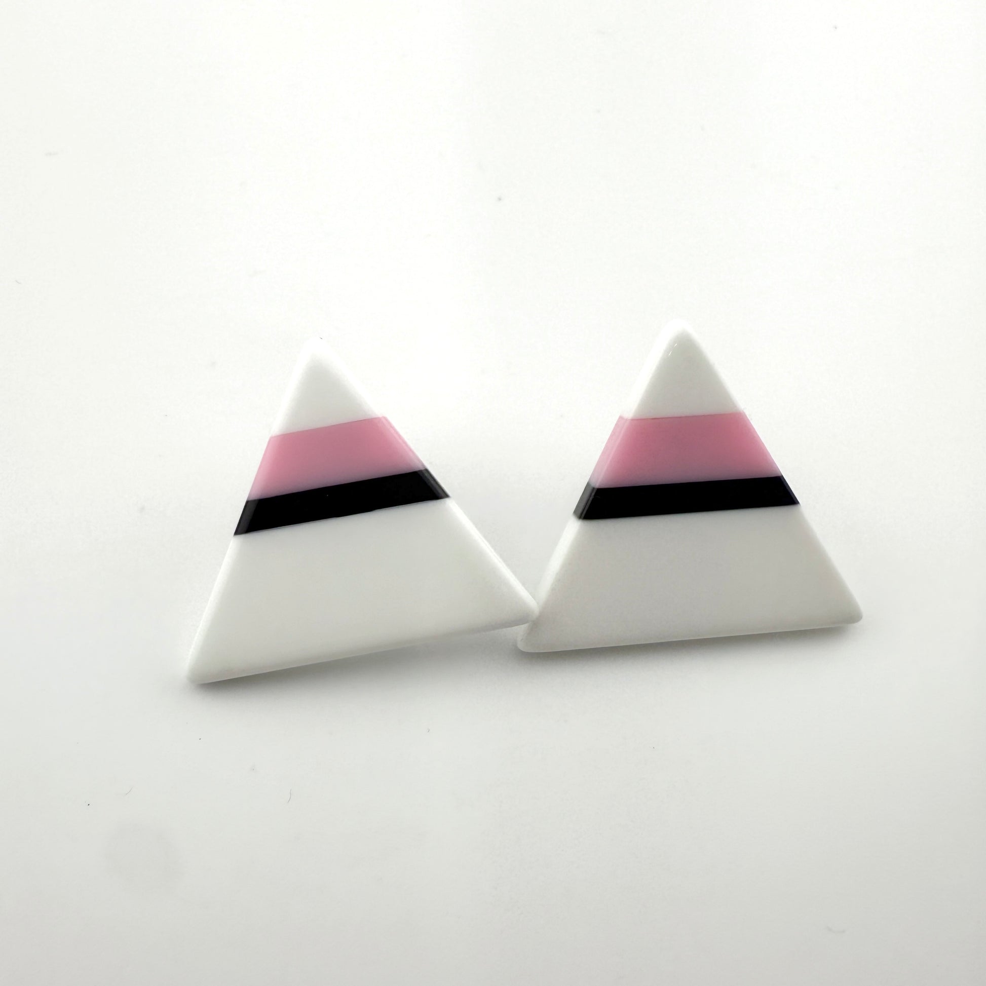 Vintage geometric clip-on earrings featuring layered white lucite with pink and black stripe detailing. Lightweight molded plastic construction with silver-tone clip backs. Classic mod / 80s-90s graphic style.