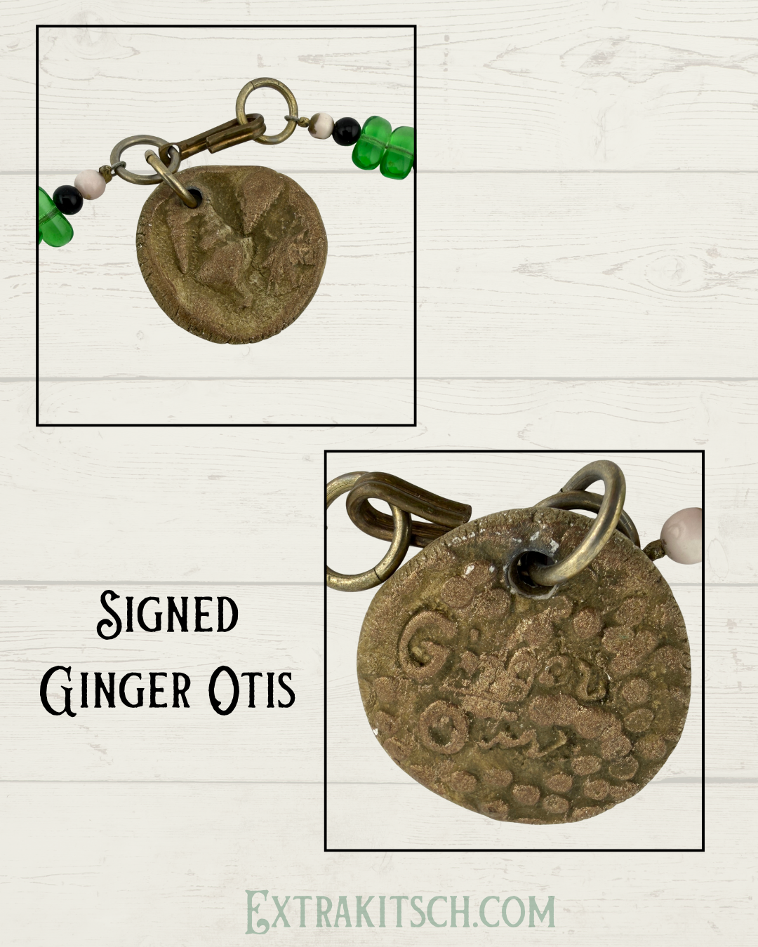 This is a stunning and completely unique vintage statement necklace featuring glass beadwork, glazed ceramic leaf beads, a small butterfly charm, and a large hand painted wood lizard focal piece. Signed on the tag - Ginger Otis. The total length of the necklace is 17” and the tail of the lizard will go down the middle of your chest when you wear this. Great condition. The only issue is some old residue on the back of the lizard. I didn’t try too hard to remove it because I didn’t want to damage the paint. It’s not sticky or anything. Check out the photos for more. |