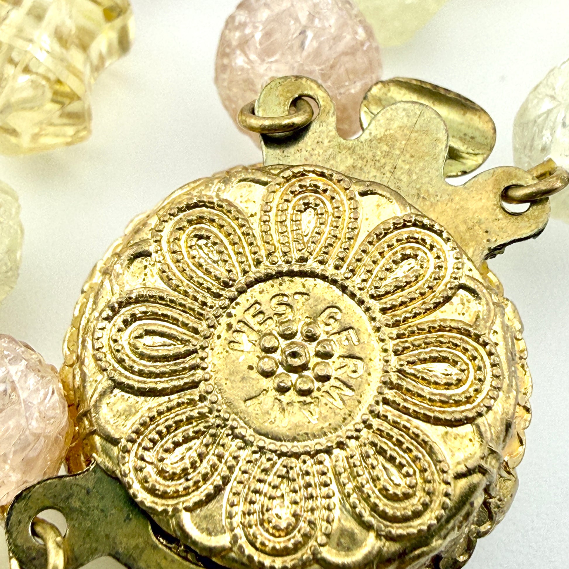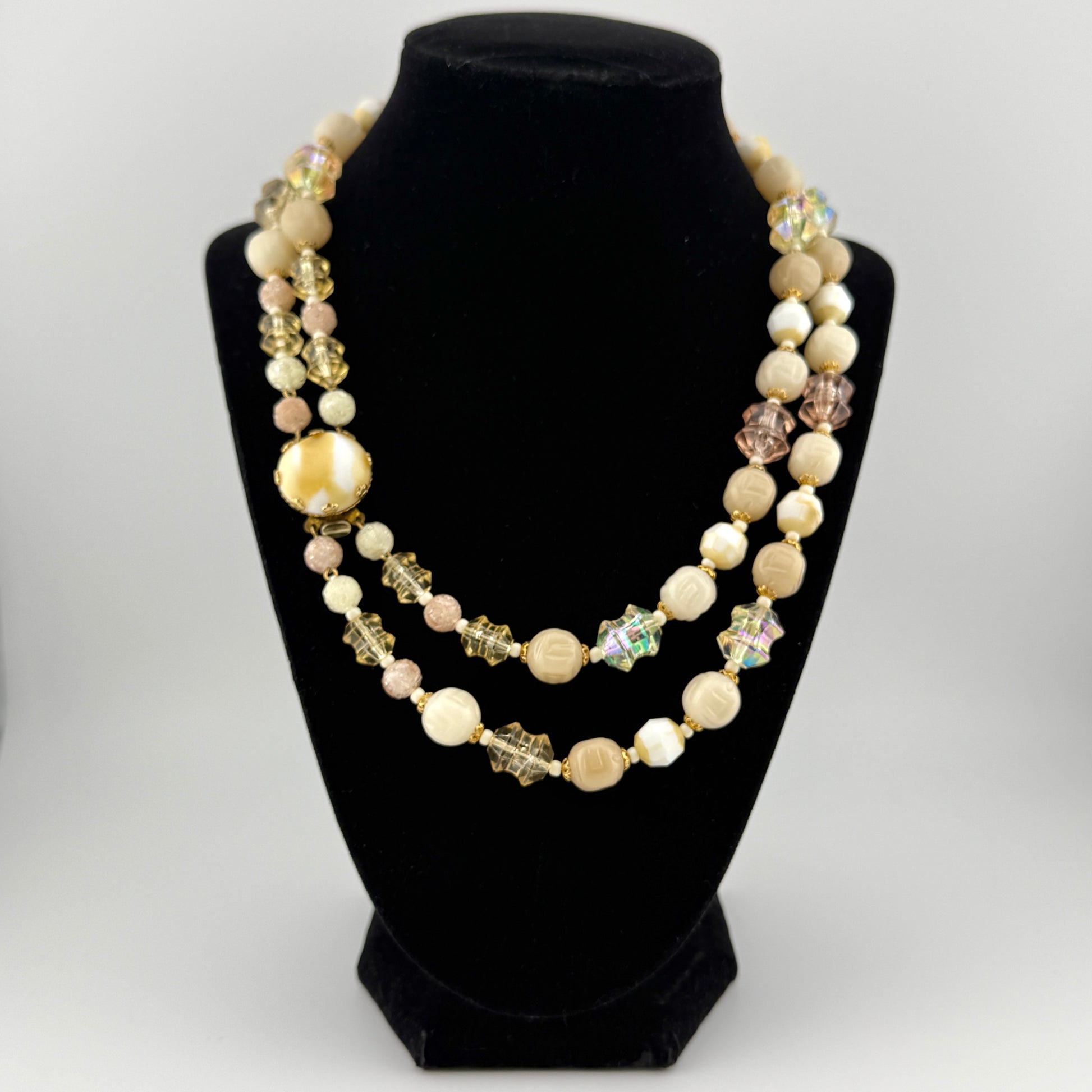 Simply stunning vintage mid-century beaded necklace with a box clasp that features a beautiful glass / faux stone cabochon that can be worn on the back or the front or the side as a statement piece. The beads are a mix of AB - aurora borealis pressed glass and possibly lucite. The neutral tones allow this to be worn with many outfits, but it does appear to be a bit fancier costume jewlery so it can be worn to events as well. Stamped West Germany on the back of the box clasp. |