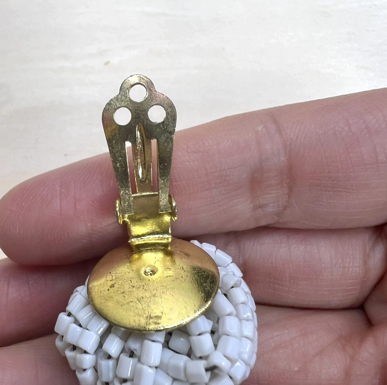 These vintage white beaded clip-on earrings are mare in a swirling knot cluster shape, they’re lightweight, feminine, and easy to wear.